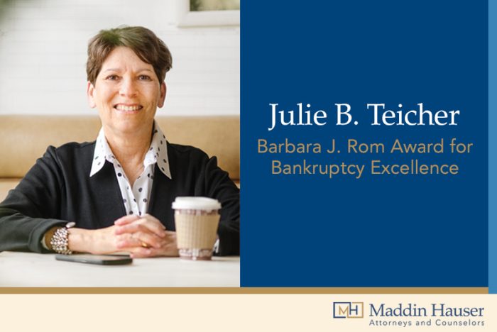 Maddin Hauser is thrilled to announce that shareholder Julie B. Teicher was selected as the 2022 recipient of the Barbara J. Rom Award for Bankruptcy Excellence from the Federal Bar Association of the Eastern District of Michigan. Chosen annually, the award winners must exhibit the highest overall excellence in the practice of bankruptcy law.