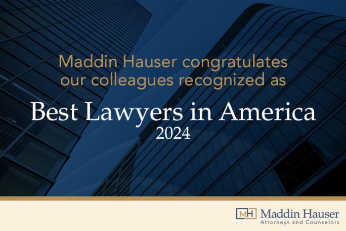 Maddin Hauser is delighted to announce that 26 attorneys have been selected for inclusion in the 2024 Edition of The Best Lawyers in America for their work across numerous practice areas.